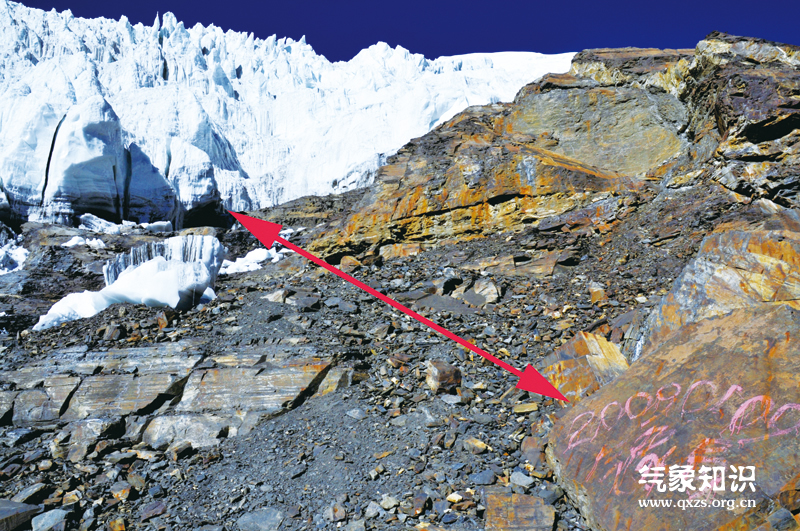 有幸的是我见到了2009年,西藏气象局的专家在这里标定的雪线的位置,才过去两年多的时间,冰川向后退却的直线距离接近40米,这确实让我感到遗憾,这些美丽的冰川也许在十几年、几十年之后就会永远地离开我们。