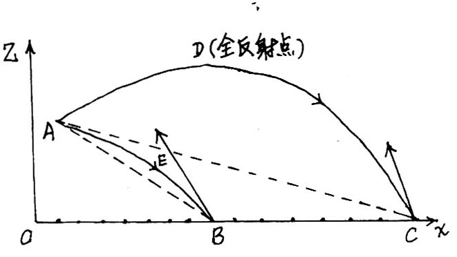 那么为什么B点的光路曲率比A点大呢?我们知道夜间辐射逆温是从地面向上方伸展的,一般情况下,逆温愈向上愈弱。但是在清晨日出以后,地面增热比空气快,所以逆温就自地面向上增强了。光路的曲率也就随高度而增加了。