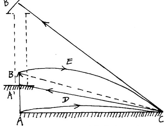 下面再解释蜃景中的物像垂直伸长的现象。图2中AB为实物,C为观察点,AC为地面。实物AB两点,经光路ADC及BEC在C点看来成为其切线方向的A′B′两点。可见蜃景比实物看来要高大得多。