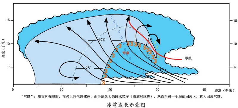 原来,在积雨云中的上升气流区存在着一个水平方向上风速基本为零的区域,称为“零域”。在“零域”下部的气流进入区内,有一个孕育冰雹长大的“摇篮”,称为冰雹形成的“穴道”。“穴道”的入口端位于主上升气流边沿,在主上升气流前沿的粒子“1”,可以在胚胎帘的趾端长大成“2”,然后下落并再进入主上升气流,标为“3”;再沿回波穹窿顶(运用气象雷达探测发展旺盛的积雨云时得到的回波图像一般称之为“钩状回波”,倒钩状回波下面的区域称为“穹窿”)进入主上升气流,长成冰雹,当上升气流托不住时,它们就会降落。而在主上升气流中的“0”粒子,由于上升气流太强,来不及长大成雹胚或小雹,就被直接吹上云顶了。