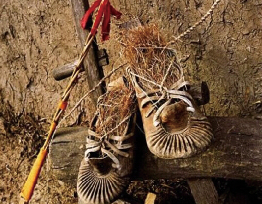 ——百褶靰鞡脚下踹。闯关东的劳工苦力,为了生活很少“猫冬”,种地之余还要放山(挖人参)、淘金、狩猎、伐木、驾车。冬天的野地里到处都是没膝的大雪壳子,平时穿的“千层底”(用废布条层层粘贴、麻绳细密行纳的鞋底)布鞋进雪就湿、降温就冻,经常是钱还没挣到先把脚给冻伤了。高筒牛皮靴穷人买不起,当地人因陋就简发明了毡靴和靰鞡。毡靴是用厚羊毛毡打成一次成型的长筒靴,底下纳上厚鞋底相当挡风保暖,至今在高寒地区室外集市上的小贩仍经常穿着。但高腰毡靴活动不十分灵便,灌进雪后更是湿冷难耐,轻便的牛皮靰鞡更受车老板(赶马车跑长途货运的人)喜爱。靰鞡鞋是满族先民发明的“没大没小、皮里灌草、脸上多褶、耳朵不少”的一种皮鞋。选料多为杏黄色的牛皮,鞋头、鞋帮、鞋底大多用一整块皮子缝制,鞋前脸边缘向内翻卷用针拱出“包子褶”,鞋面两侧缝上三四对“皮耳子”(用于串鞋带的皮环),鞋帮里缝上盖住脚面的“靰鞡面”(鞋舌头),后帮接缝处缝上“提把儿”(提鞋的三角形皮条),鞋底夹层厚皮子,后跟钉上扁钉,一双憨头憨脑、鞋褶均匀、帮底一体的牛皮靰鞡就大功告成了。配上“靰鞡靿”(裹脚布)、皮条或麻绳鞋带,絮上靰鞡草就可以穿了。老话讲:“抄山路,走近道,靰鞡不分大小号。”就是说牛皮靰鞡并不按尺码做,价格也按重量计算,越重越贵。穿着通过草的薄厚找齐脚的大小,一般人都买大鞋,这样草可以垫得厚些暖和。鞋面多褶、鞋带反复捆扎是为了更好地固定好草,防止鞋变形、草串位穿着不舒服。靰鞡鞋皮帮皮底防湿、耐潮、阻渗(雪)性能极好,结实耐用、轻便灵活及其适应冰天雪地下户外穿越与劳作。东北荒原“靰鞡草”随用随取、物美价廉,草犹如羊胡子般柔软、细腻、不划手,用棒槌打软后絮在鞋里形成麻丝般、蜂窝状的空隙蓬松吸汗、透气养脚。关东穷人最懂得“惟有草一束,贫贱得御寒” 的真谛,将之与人参、貂皮并称关东三宝(人参是穷棒子为了“谋生”来关东赶山所得,貂皮是猎户为了养家糊口的“杀生”之物,“靰鞡草”是车老板死冷寒天奔波的“养生”之法,都是求生存的必然选择。而鹿茸大多是大户人家圈养梅花鹿用来滋养之物,多少有点小众,民俗内涵与民风基础略逊一筹)。在过去大车店(平价旅馆)的火炕、灶台上随处散放烘烤着牛皮靰鞡与满屋弥漫着的臭脚丫子味道,告诉我们过去的生活是多么艰辛与无奈啊!牛皮靰鞡太丑陋、太土气、太廉价,早就不受人待见了,现在只能在民俗博物馆还能寻觅到它的身影,皮毛一体的大头皮鞋早已成为时尚宠儿。