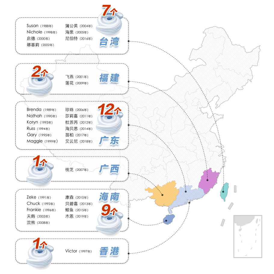 1988—2019年,我国的初台最常登陆的是广东、海南和台湾。其中广东登陆年份最多,为12个。