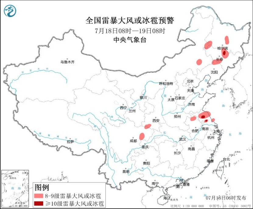 图2 全国雷暴大风或冰雹预警(7月18日08时-19日08时)